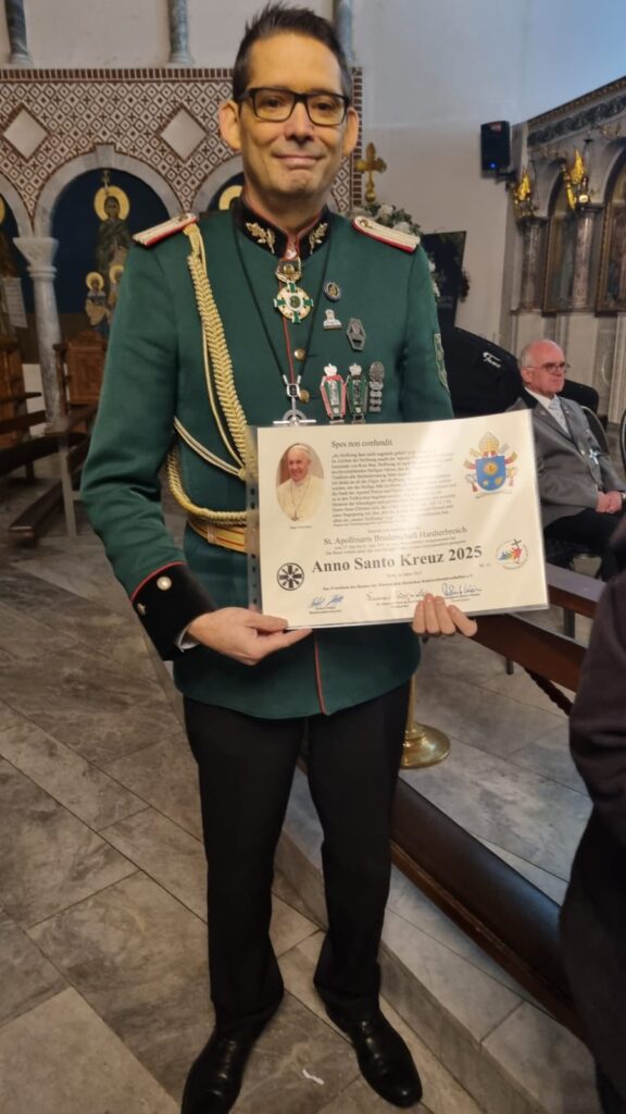 Auch unsere Bruderschaft wurde in diesem Rahmen ausgezeichnet. Unser Kassierer Marcel Sturm durfte als Teilnehmer der EGS Wallfahrt im Sommer dieses besondere, vom Papst gesegnete, Kreuz in Empfang nehmen.
